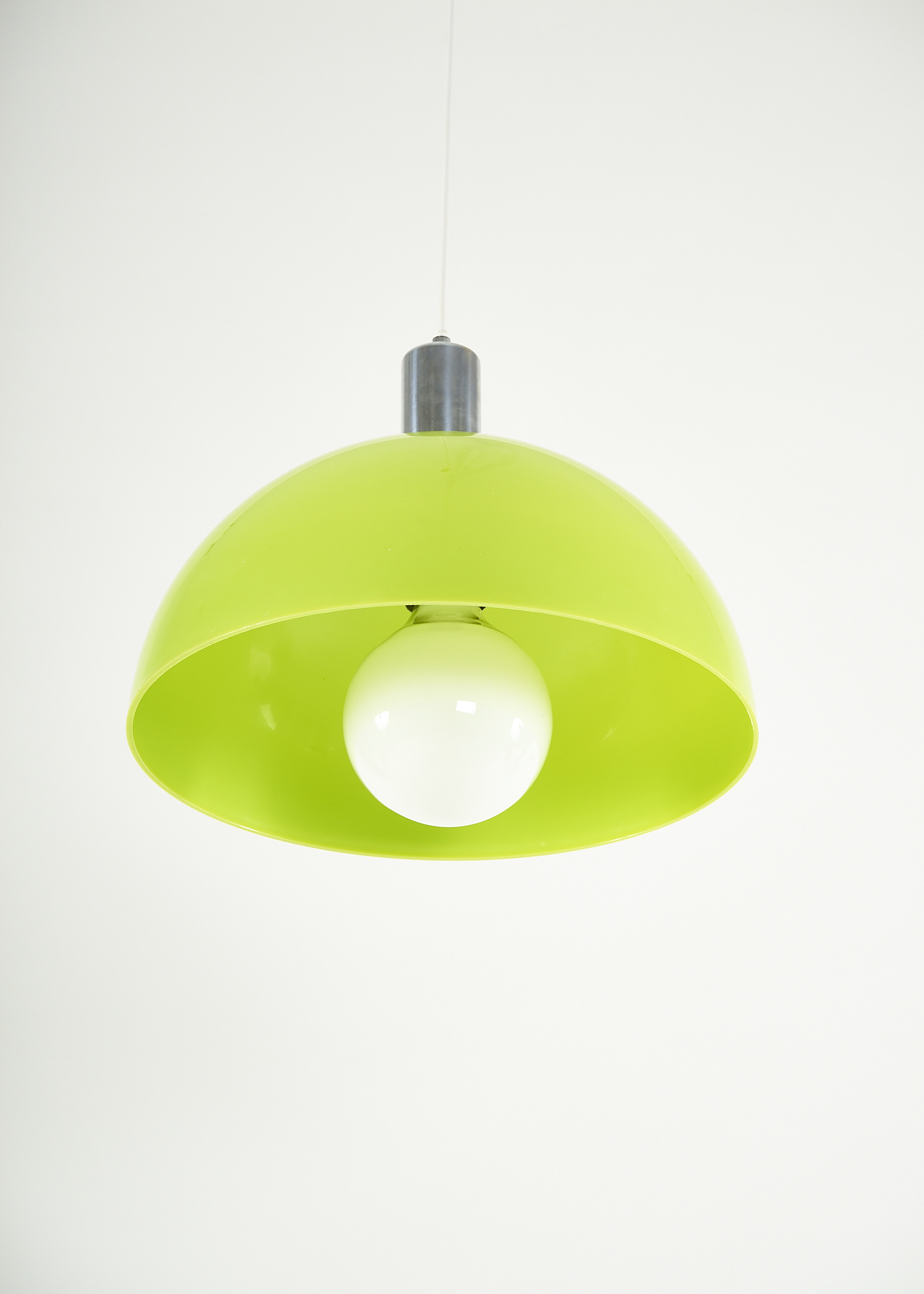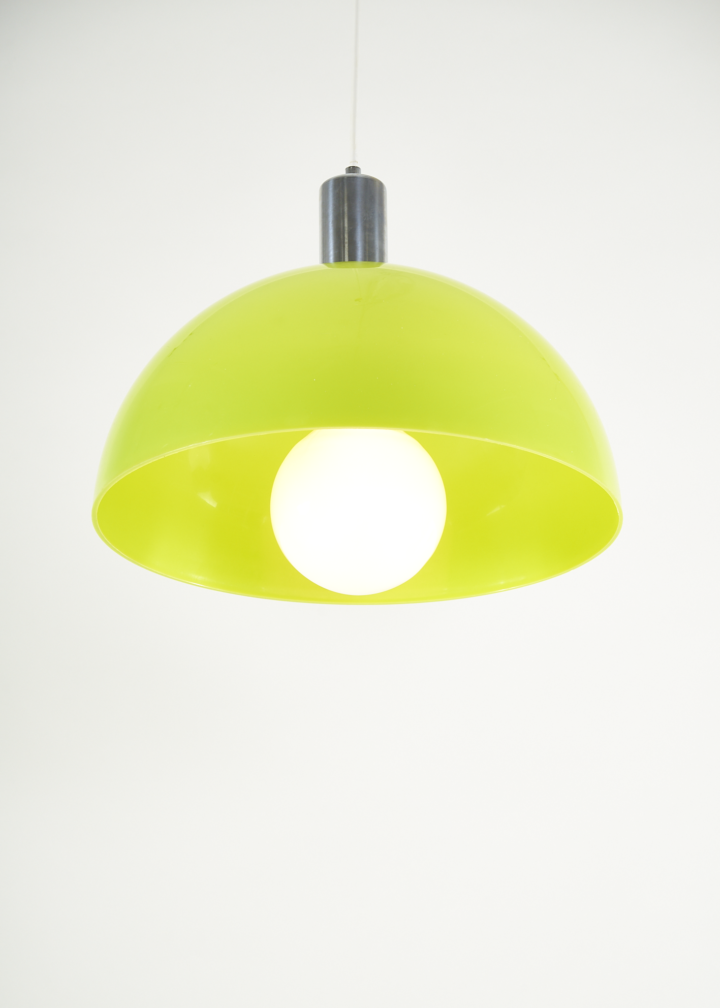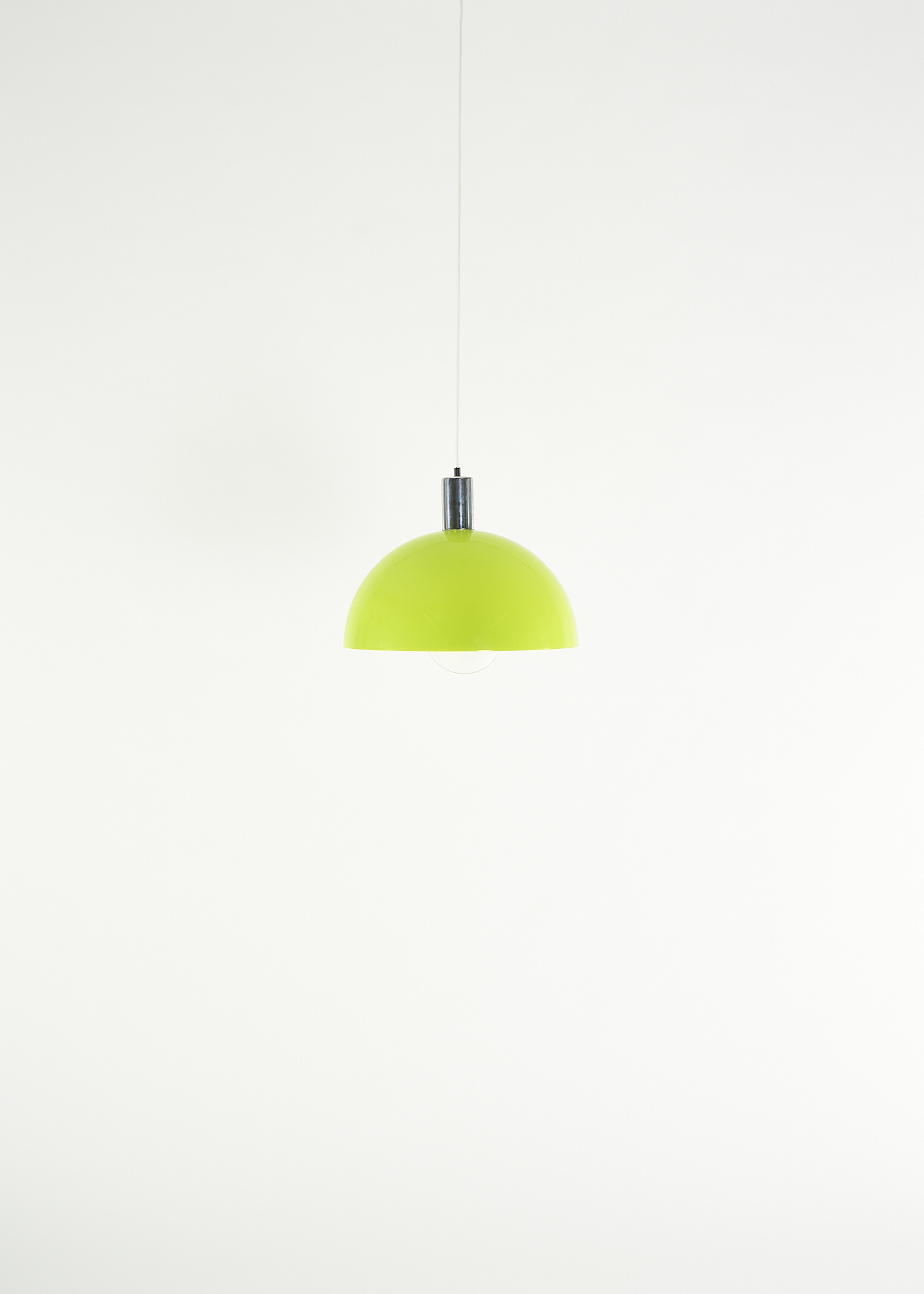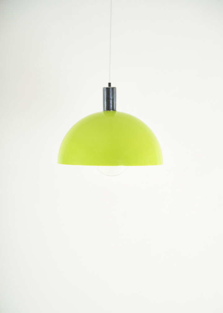 From unknown origins, this 1970s pendant lamp is as simple as it gets. Its standout feature is the acid green acrylic dome, which casts a soft yet distinctive glow.