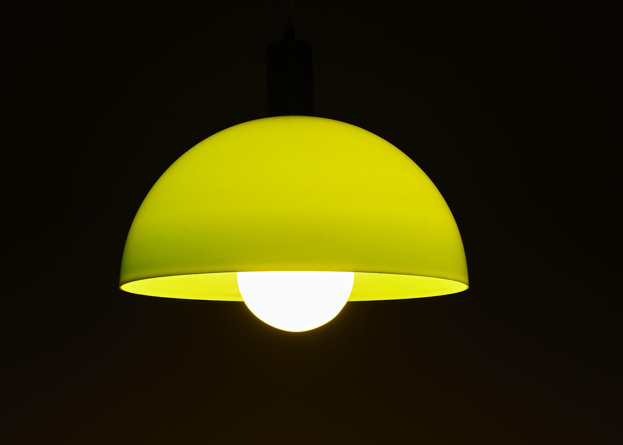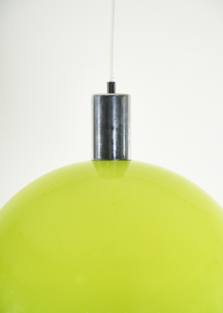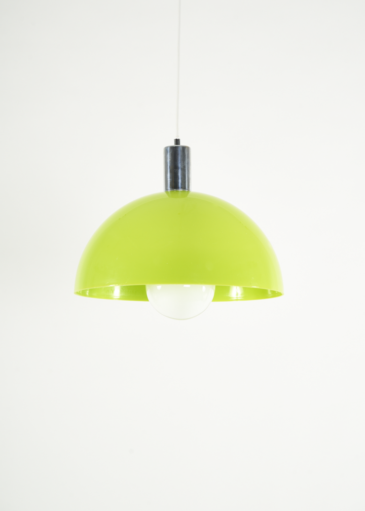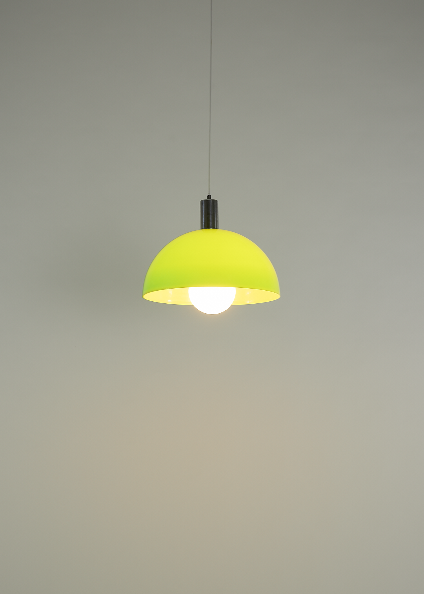From unknown origins, this 1970s pendant lamp is as simple as it gets. Its standout feature is the acid green acrylic dome, which casts a soft yet distinctive glow.