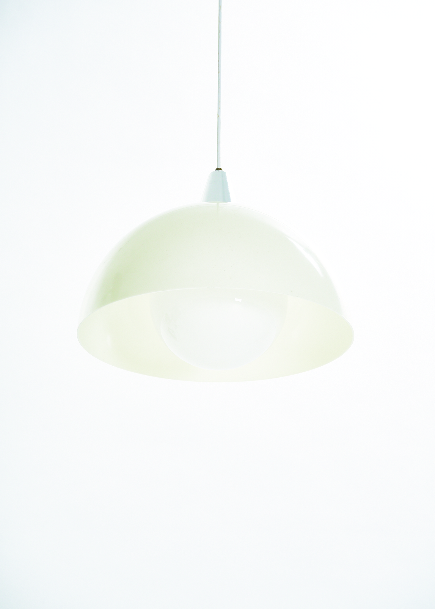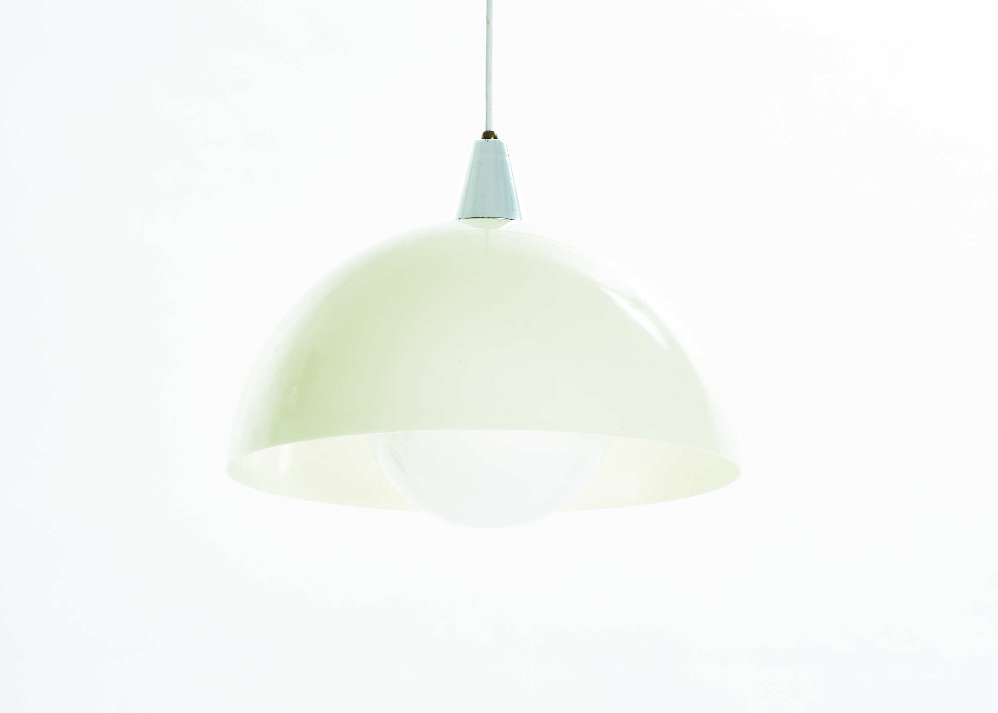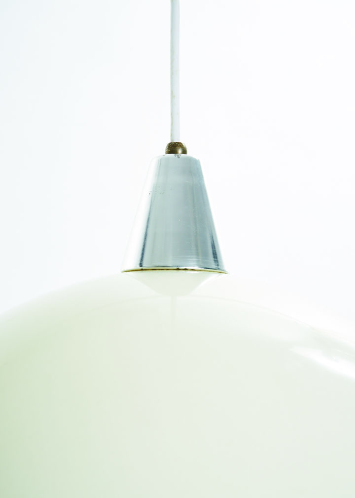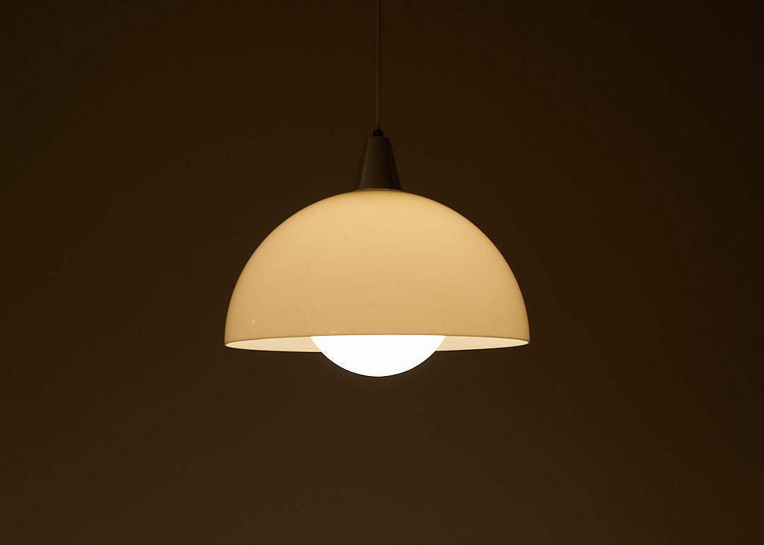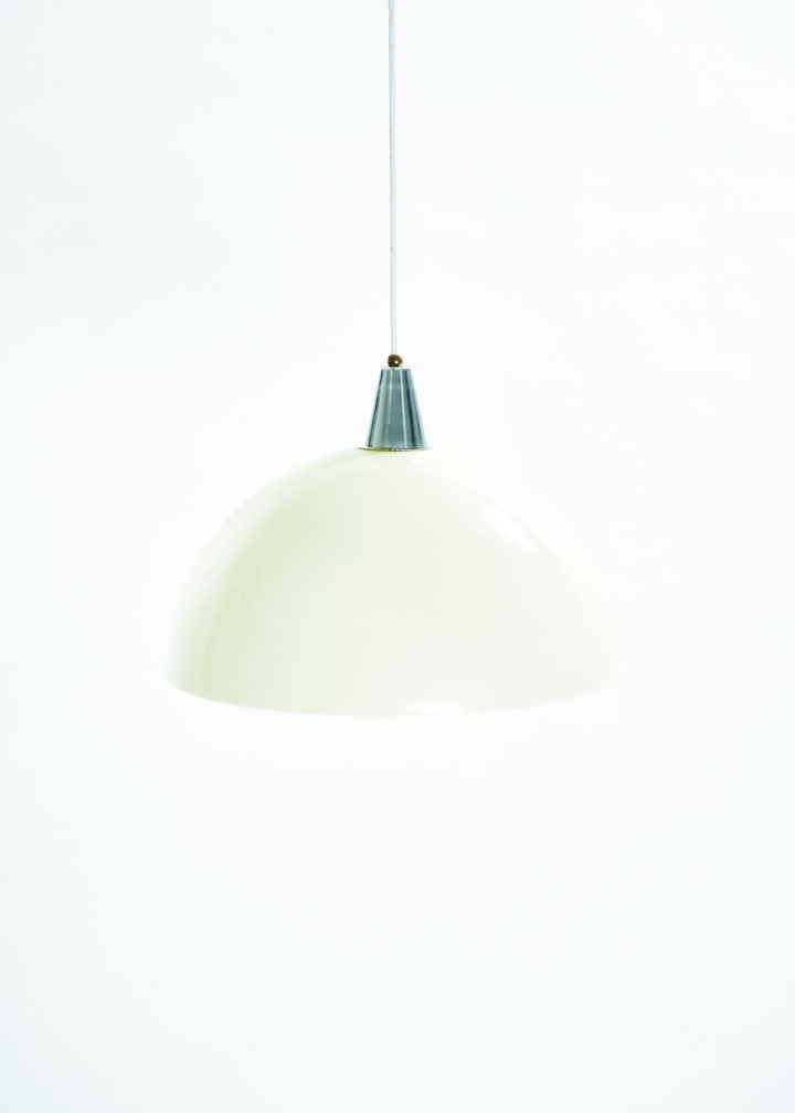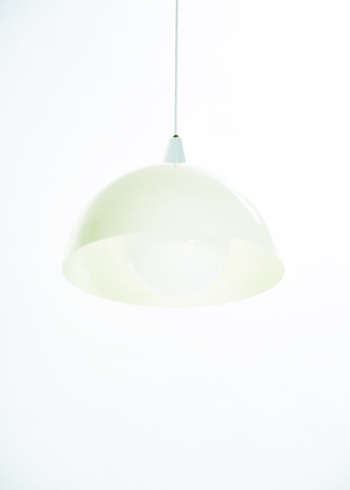 From unknown origins, this 1970s pendant lamp bears a striking resemblance to Verner Panton’s iconic Flowerpot collection. Its standout feature is the off-white acrylic dome, which casts a soft, warm glow. The bulb sits behind a glass diffuser, gently softening the light to prevent glare.