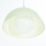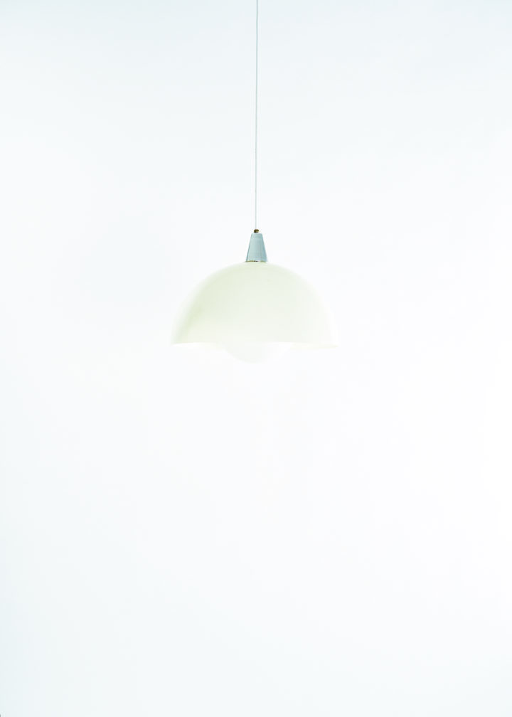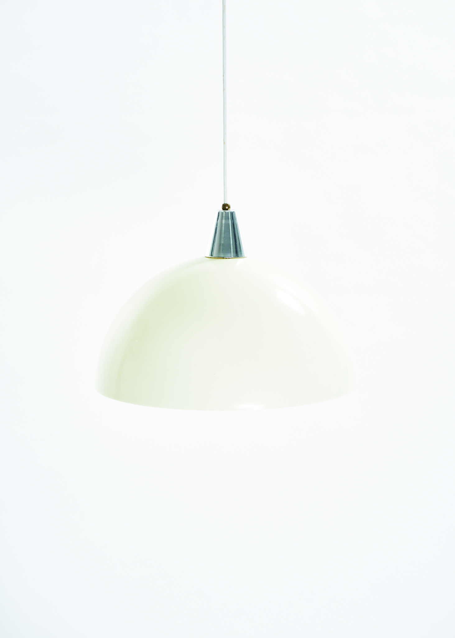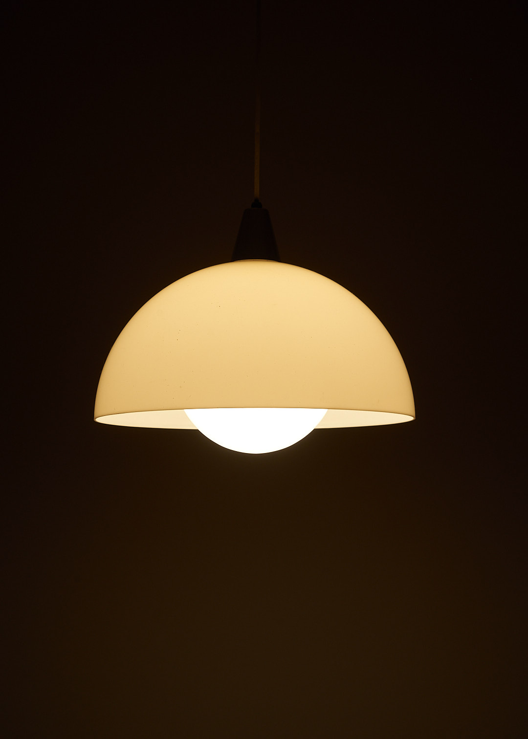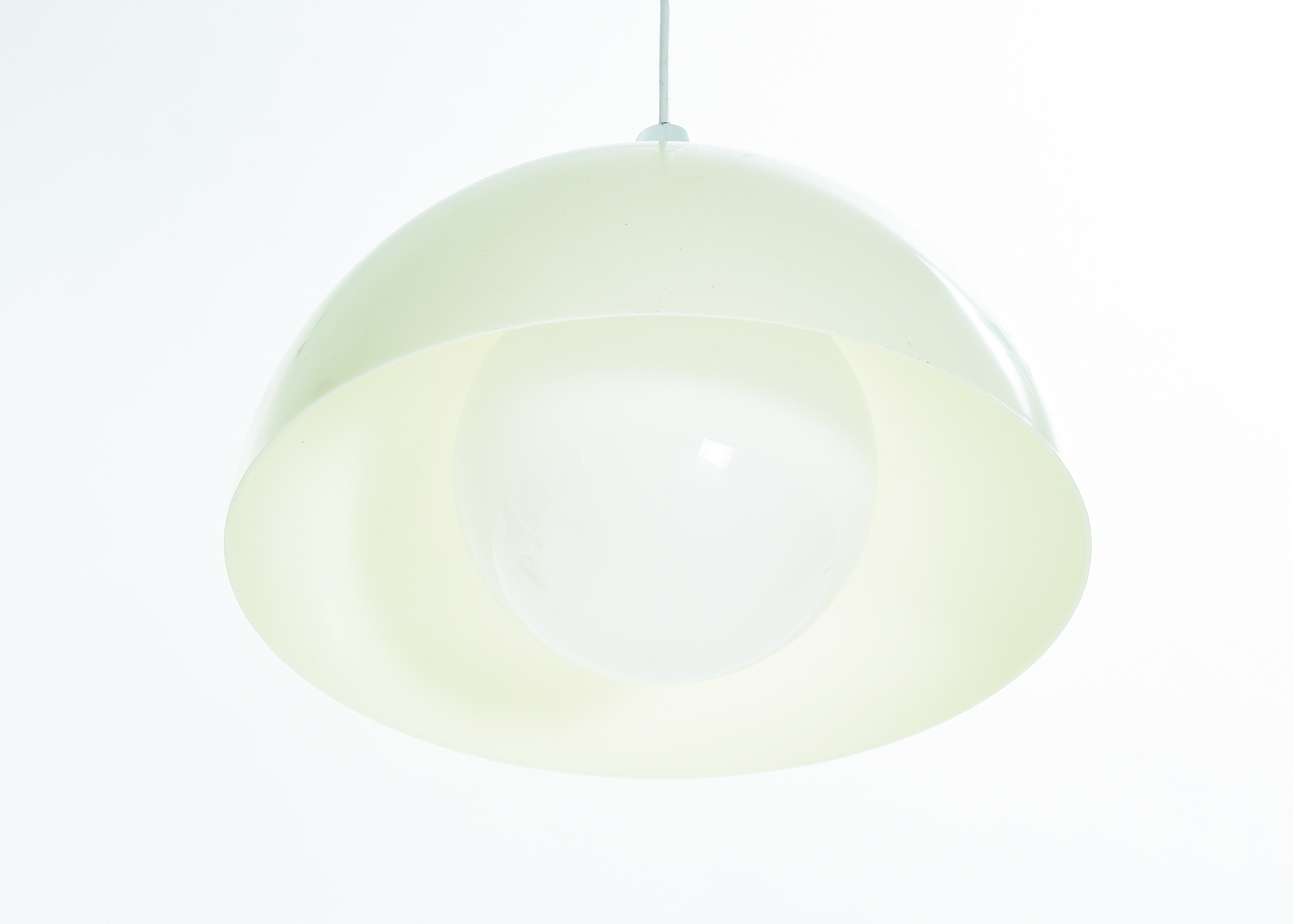 From unknown origins, this 1970s pendant lamp bears a striking resemblance to Verner Panton’s iconic Flowerpot collection. Its standout feature is the off-white acrylic dome, which casts a soft, warm glow. The bulb sits behind a glass diffuser, gently softening the light to prevent glare.