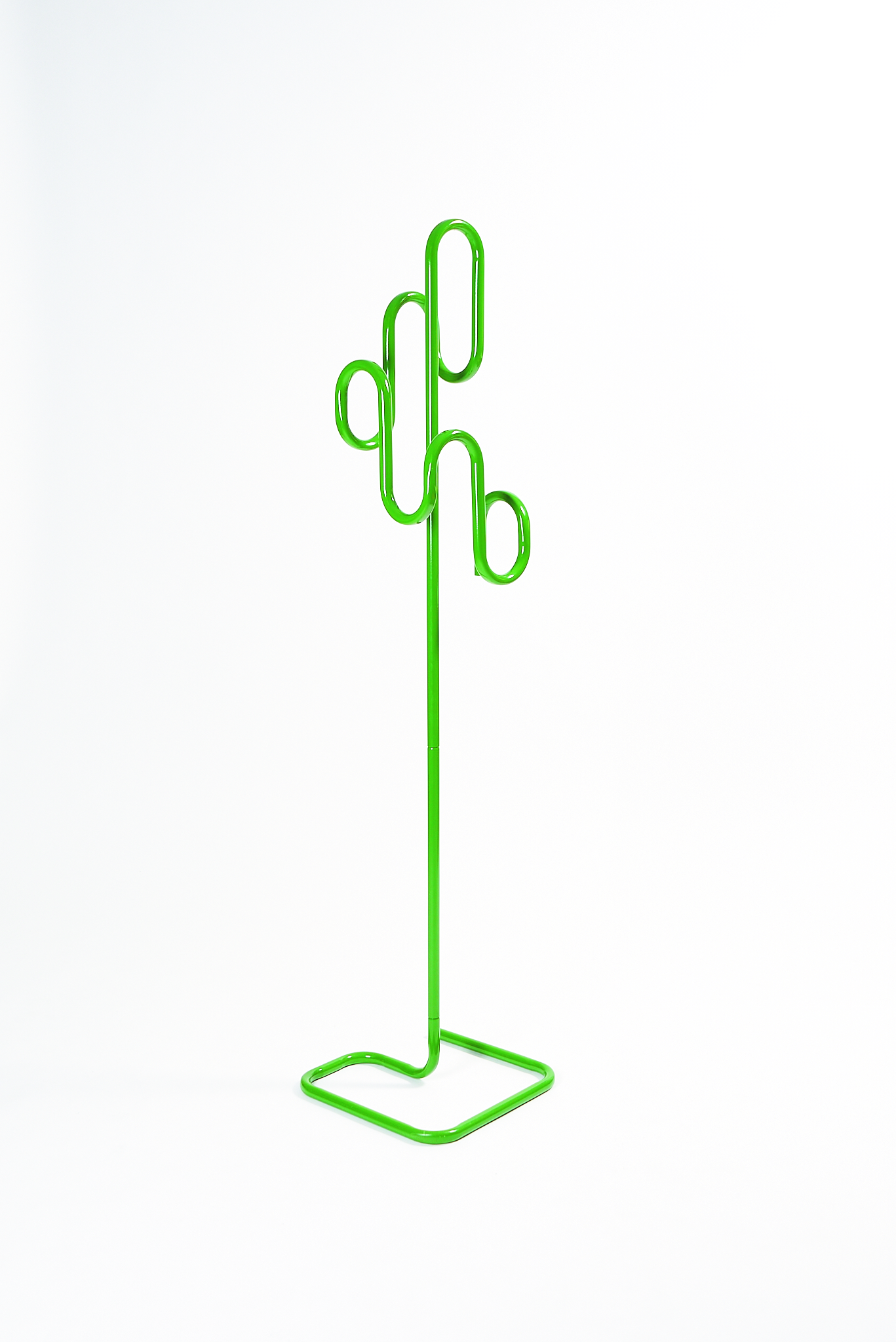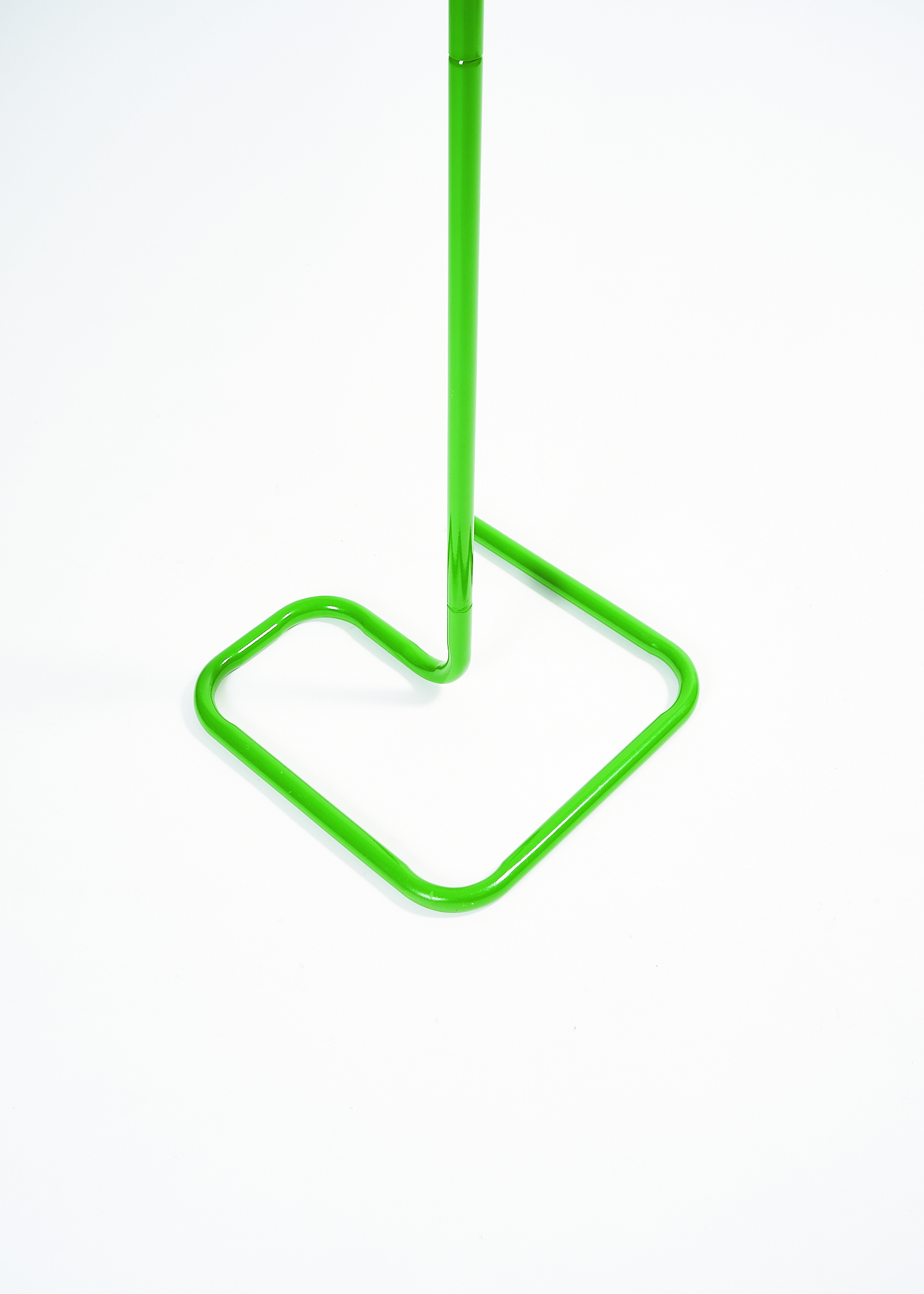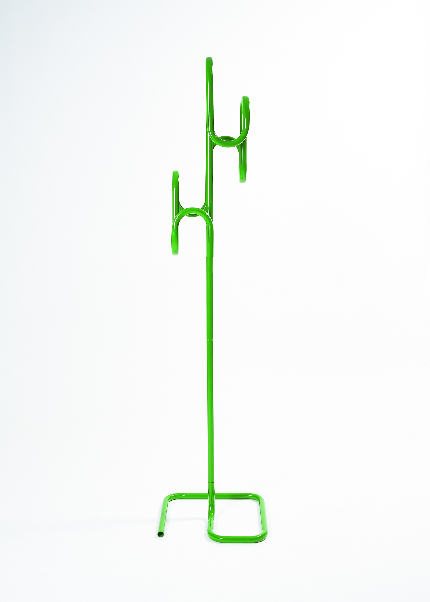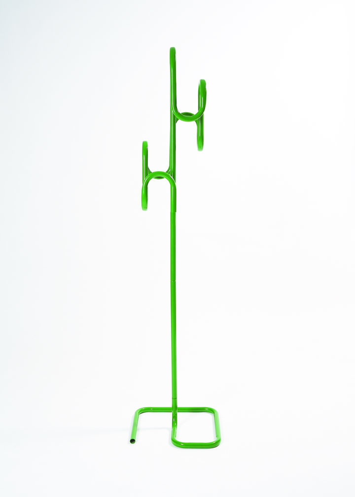 Truly a favorite. Although not much is known about it, this stunning piece was distributed in Quebec by Les Distributions Jacques Brien and was nicknamed the “Cactus”. Exploring the process of tube bending to its full potential, this coat stand is made of three pieces that can be disassembled for ease of shipping. Refinished professionally in a “Grass green” powder coat.