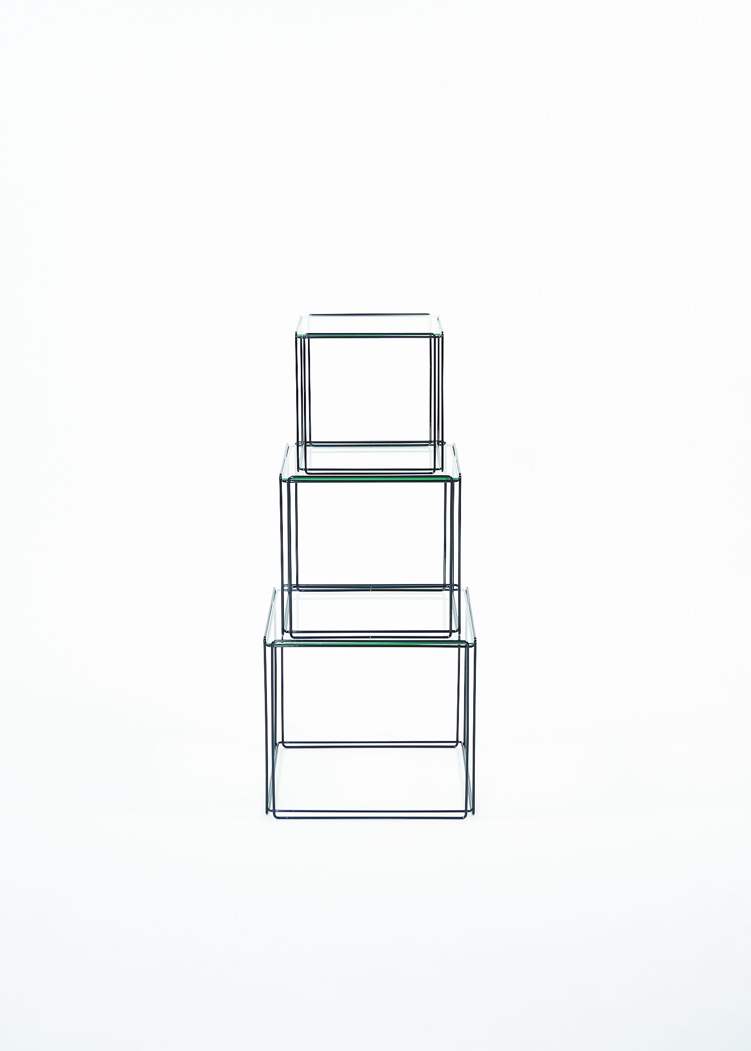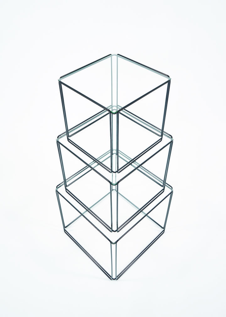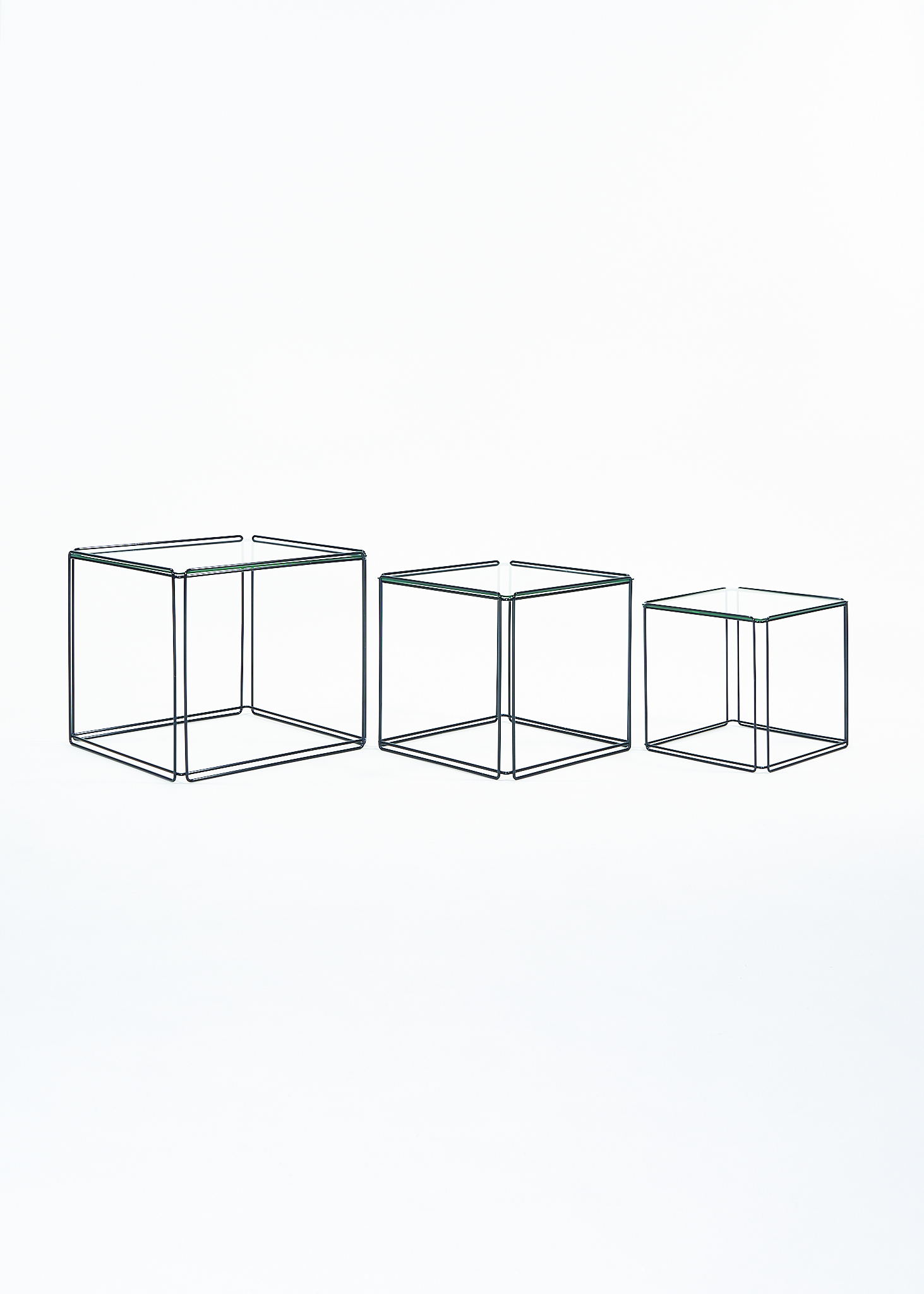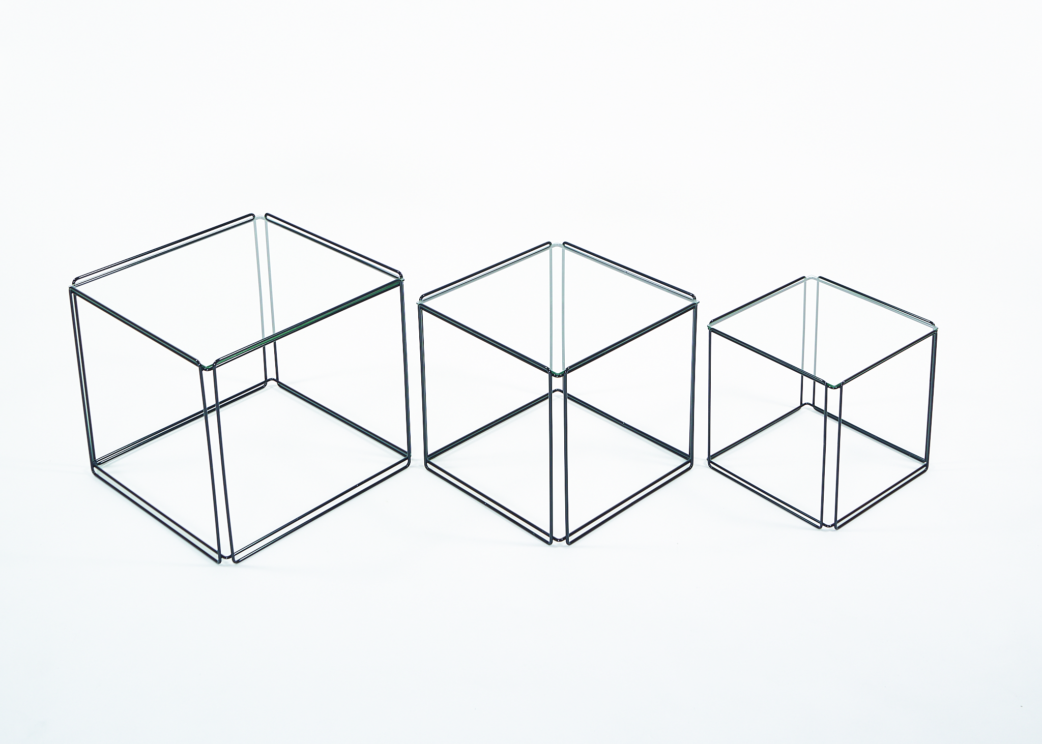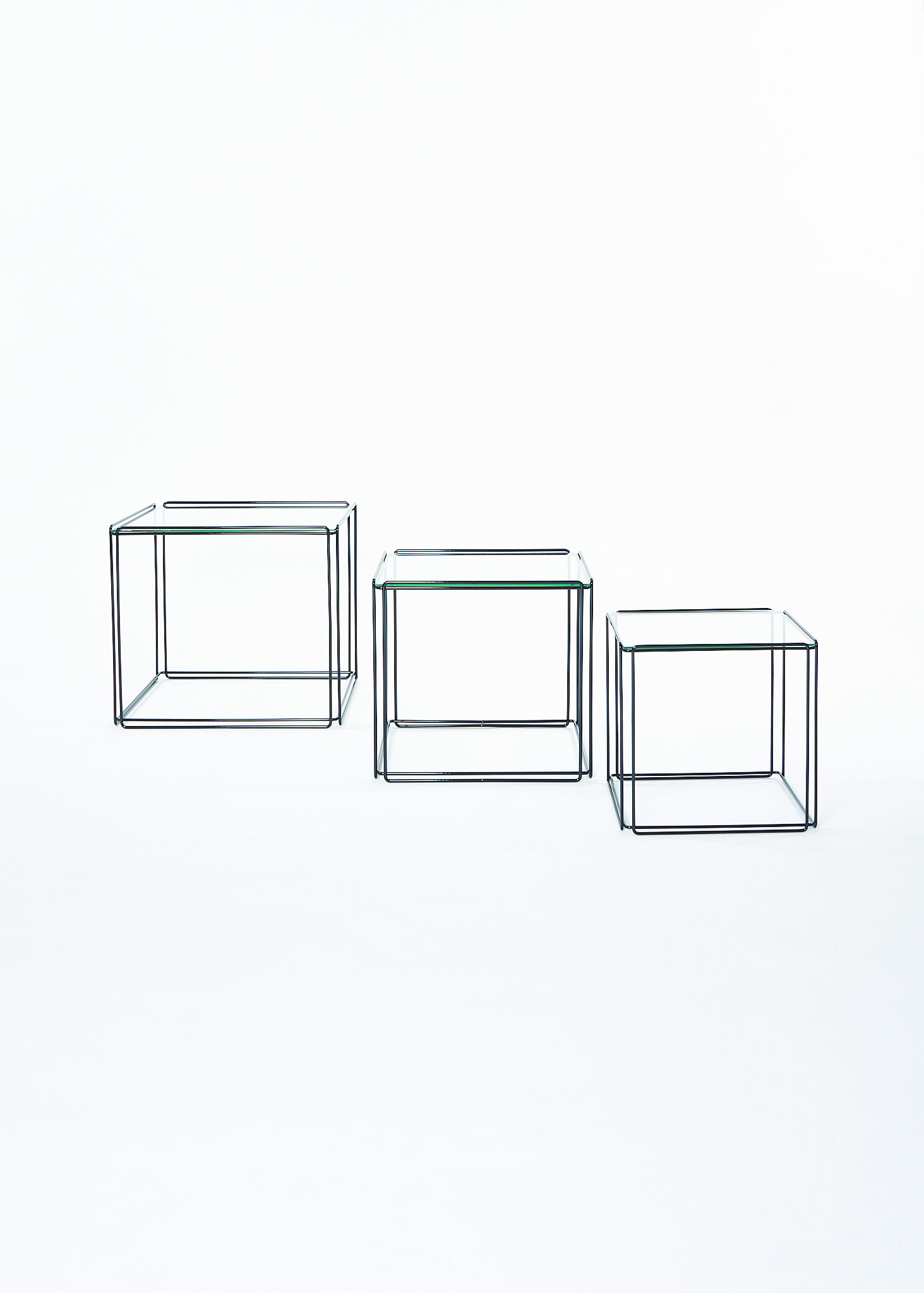 A classic and recognizable design from the 1970s, the Isocele nesting tables were designed by franco-algerian designer Max Sauze. An ingenious arrangement of six square frames, each Isocele table makes the most of simple geometry to achieve a striking visual composition. The steel frames have been professionally refinished in a glossy “Mercedes Black” powder coat.