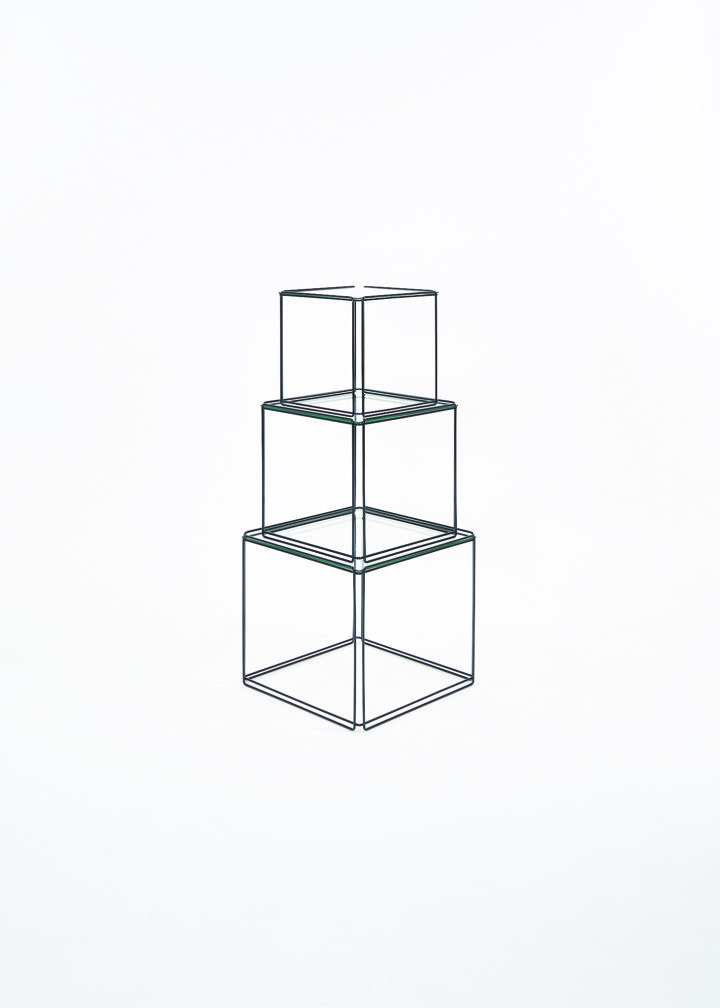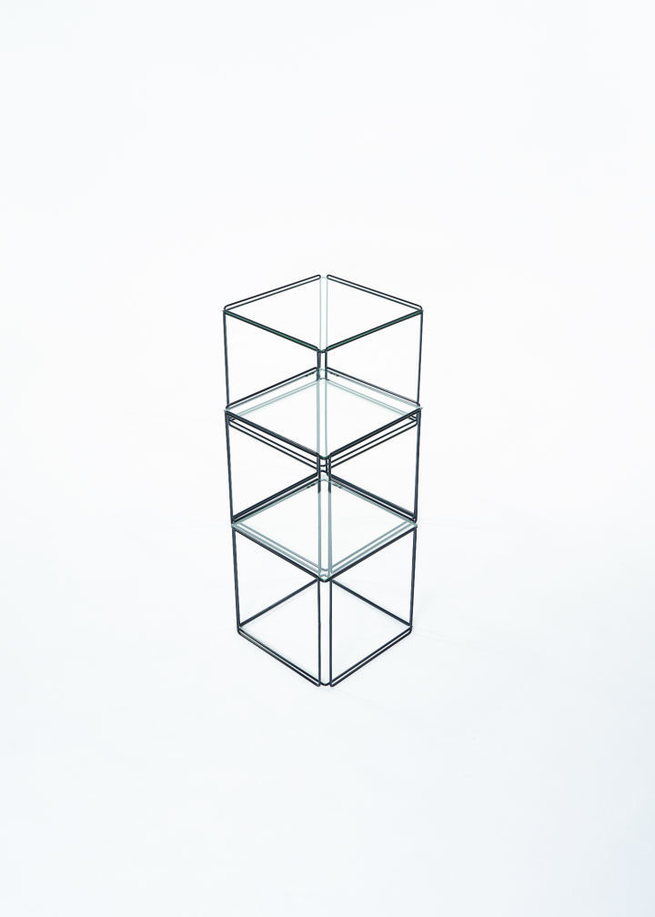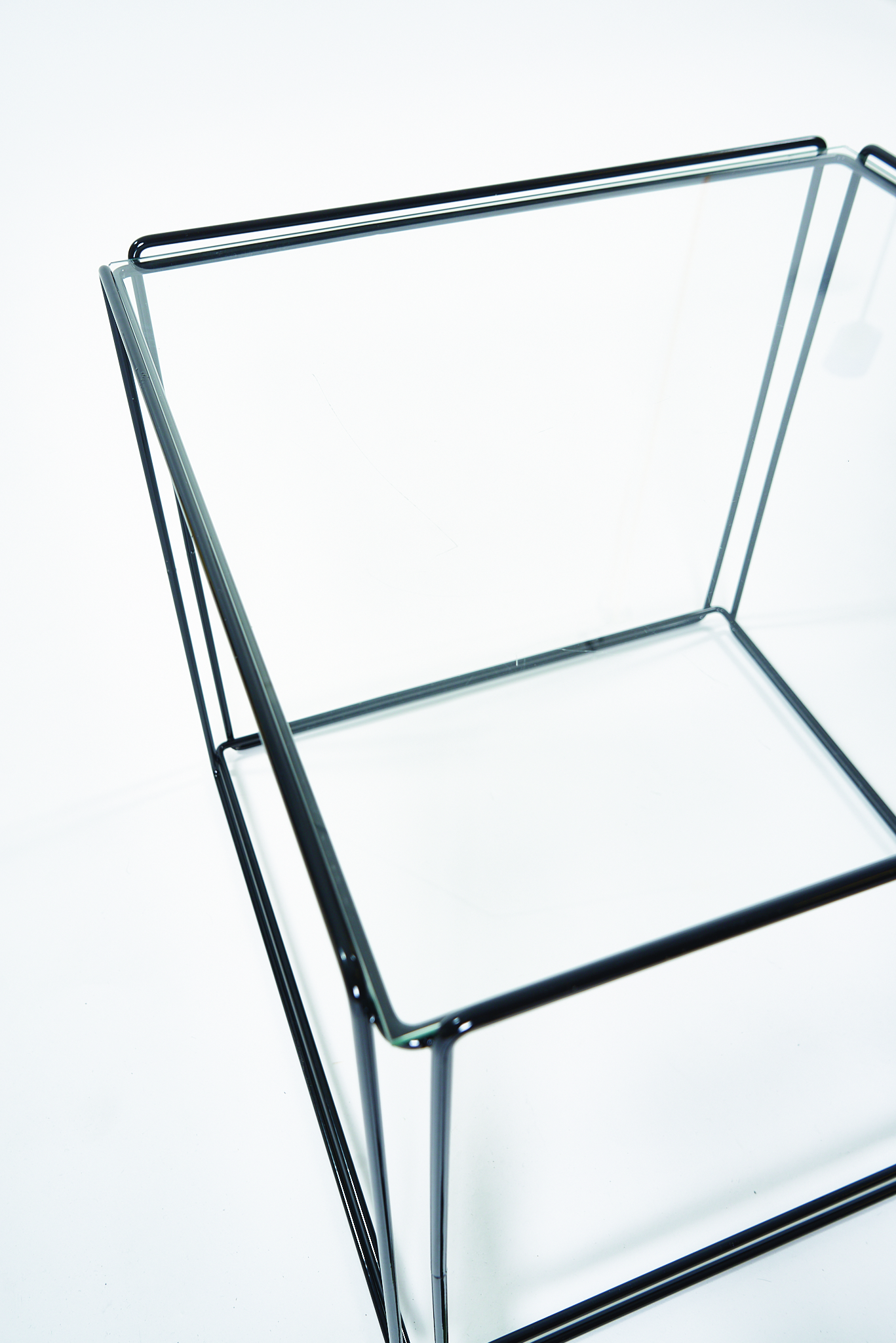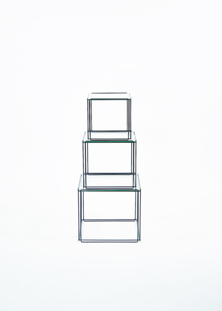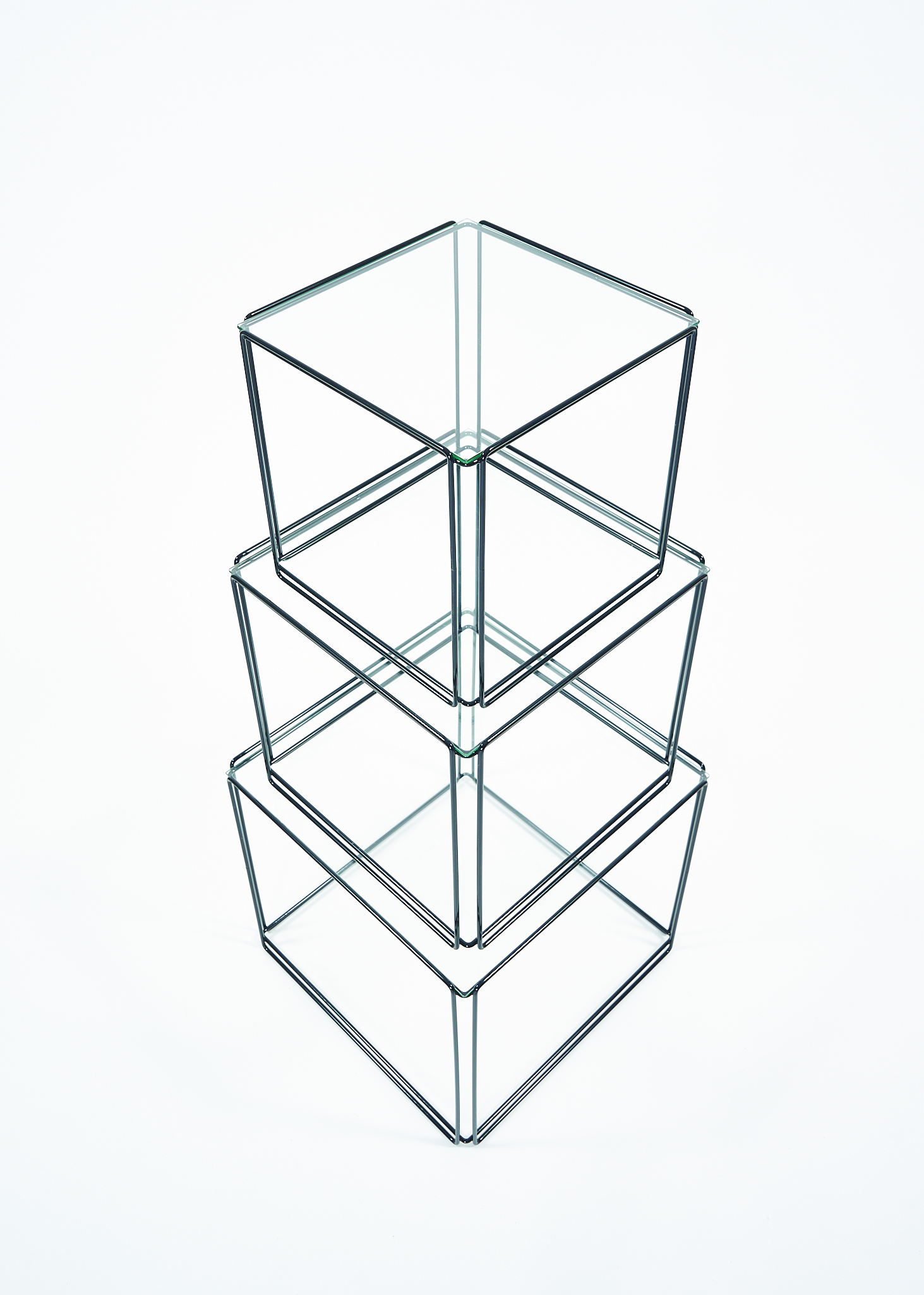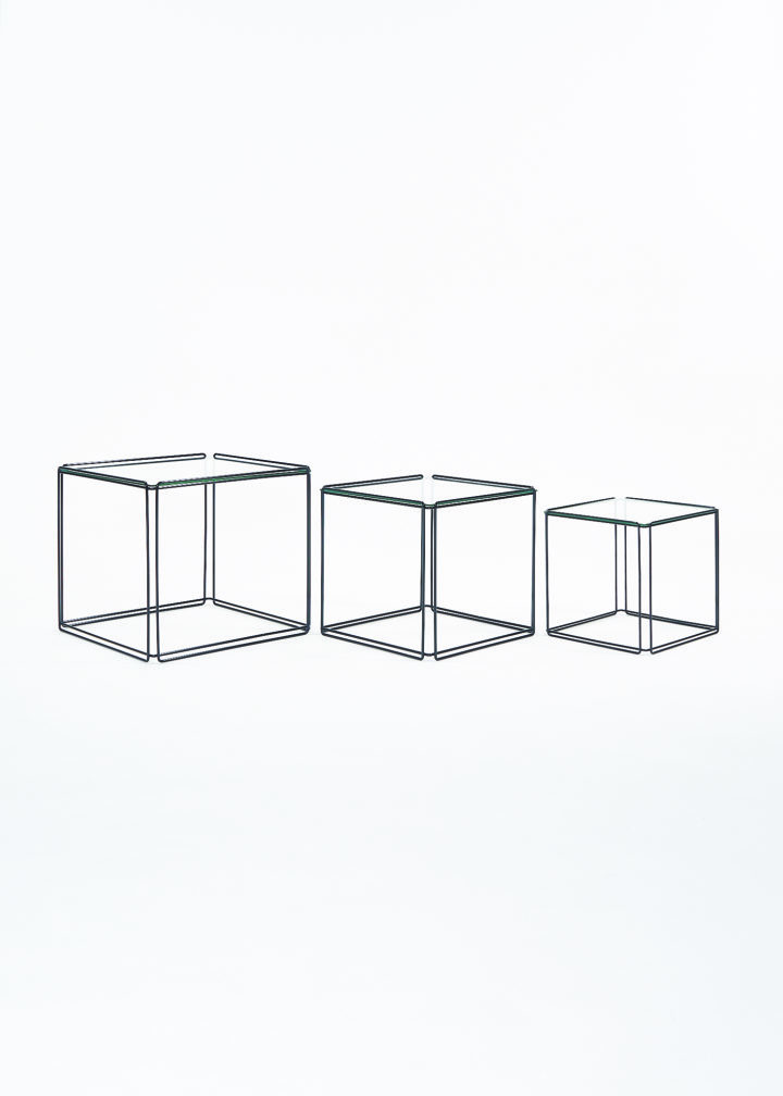 A classic and recognizable design from the 1970s, the Isocele nesting tables were designed by franco-algerian designer Max Sauze. An ingenious arrangement of six square frames, each Isocele table makes the most of simple geometry to achieve a striking visual composition. The steel frames have been professionally refinished in a glossy “Mercedes Black” powder coat.
