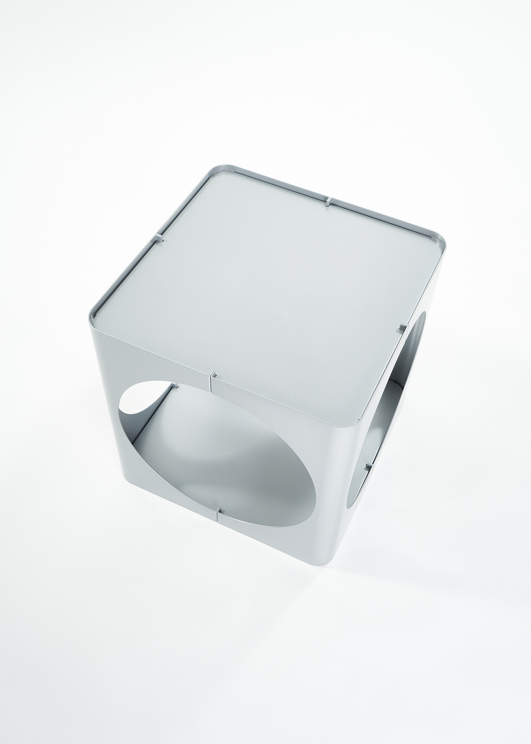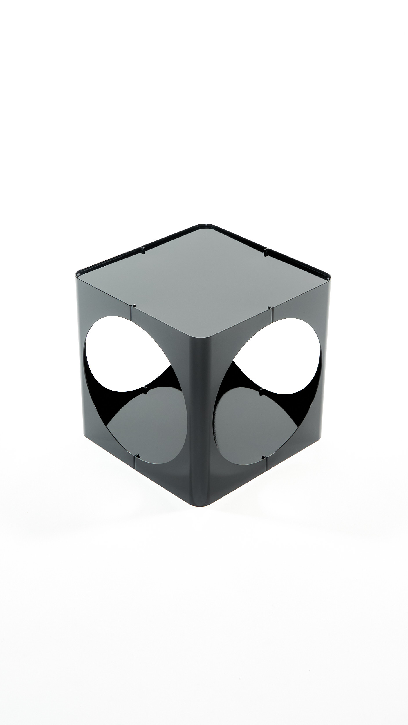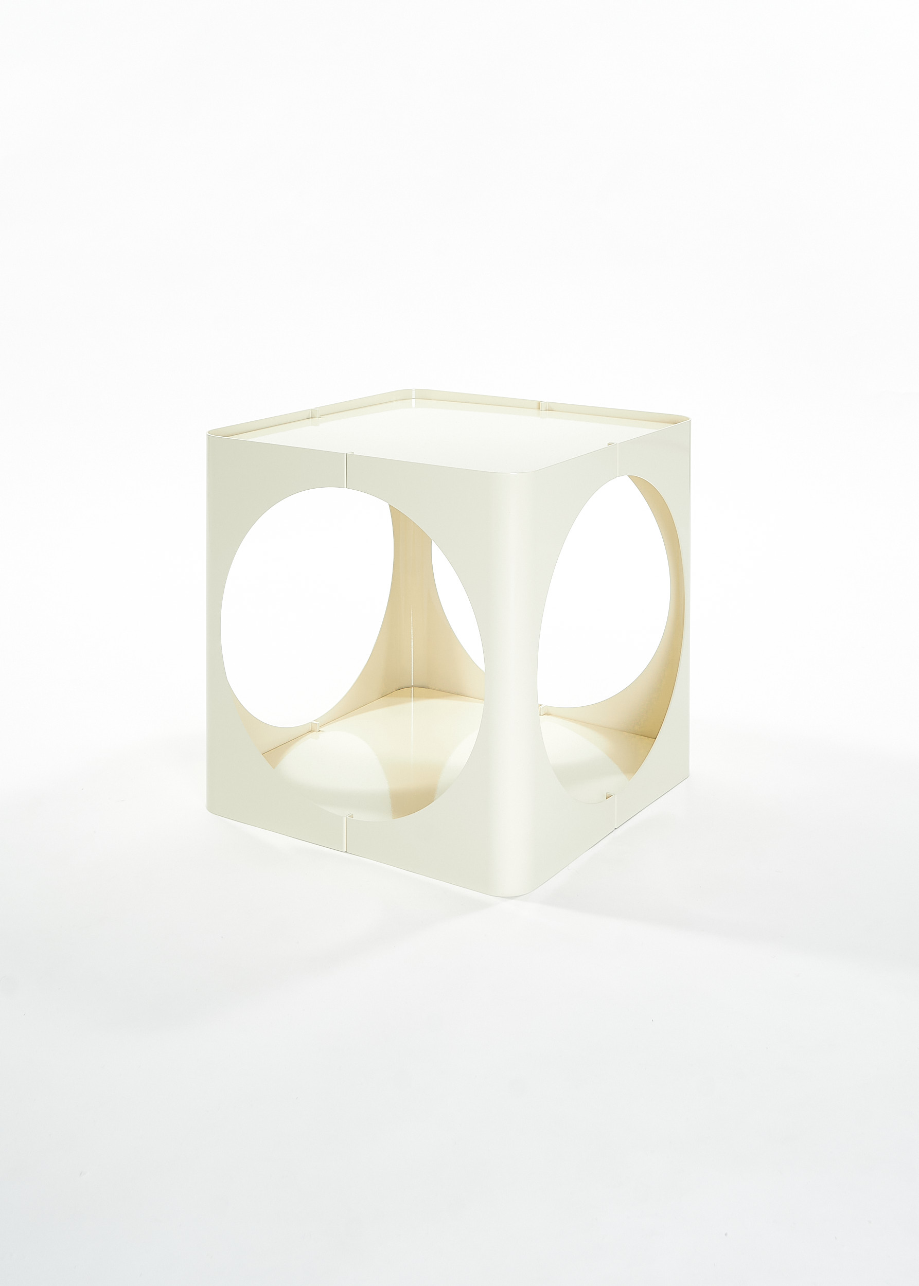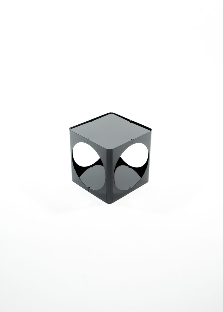 The RELAUNCH side table revisits a familiar modern design archetype: a cubic volume punctured by circular openings. While often associated with Joe Colombo, this form appeared in numerous variations throughout the late 1960s and 1970s, reproduced and reinterpreted so widely that its authorship gradually shifted from individual to collective.