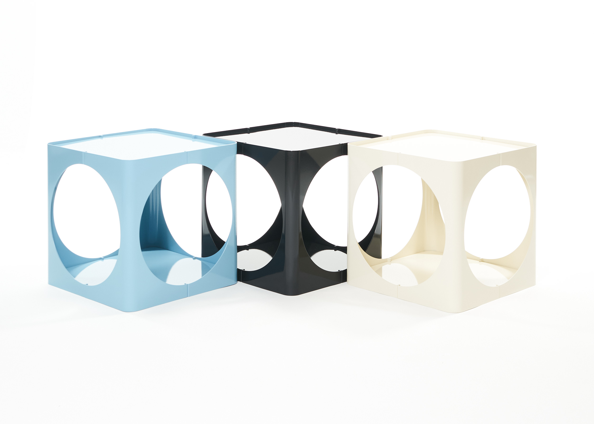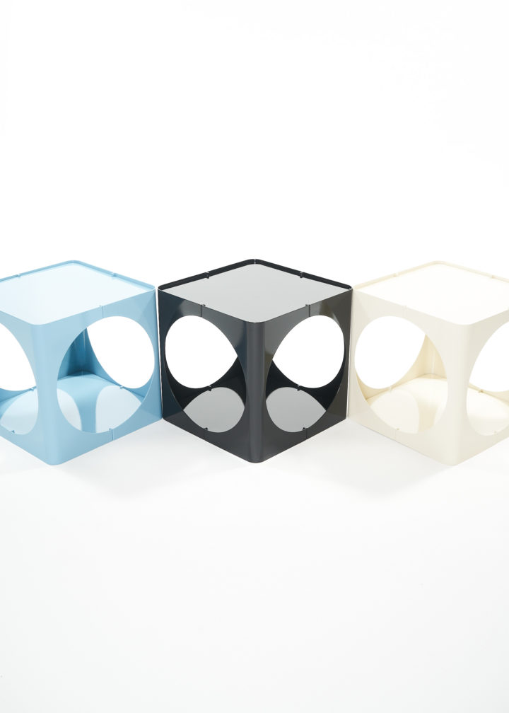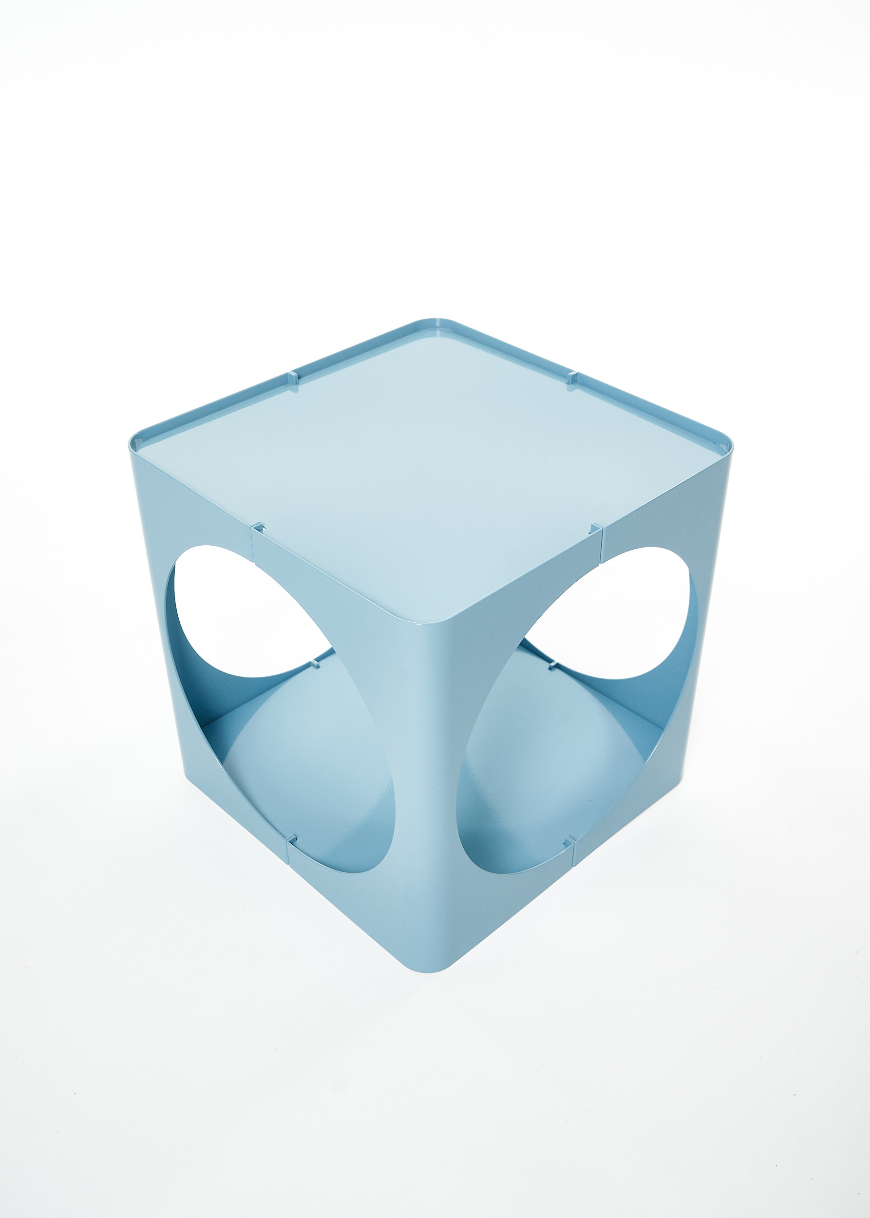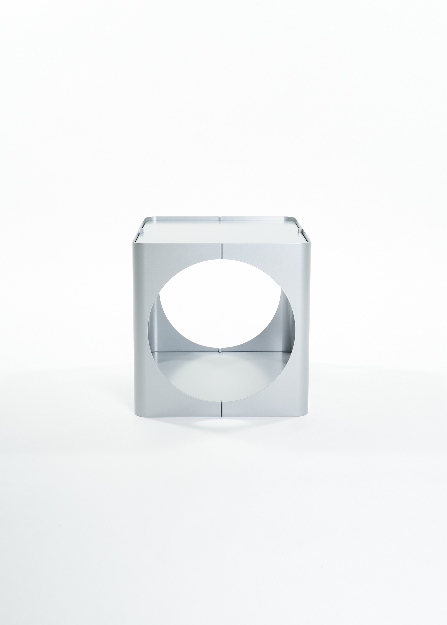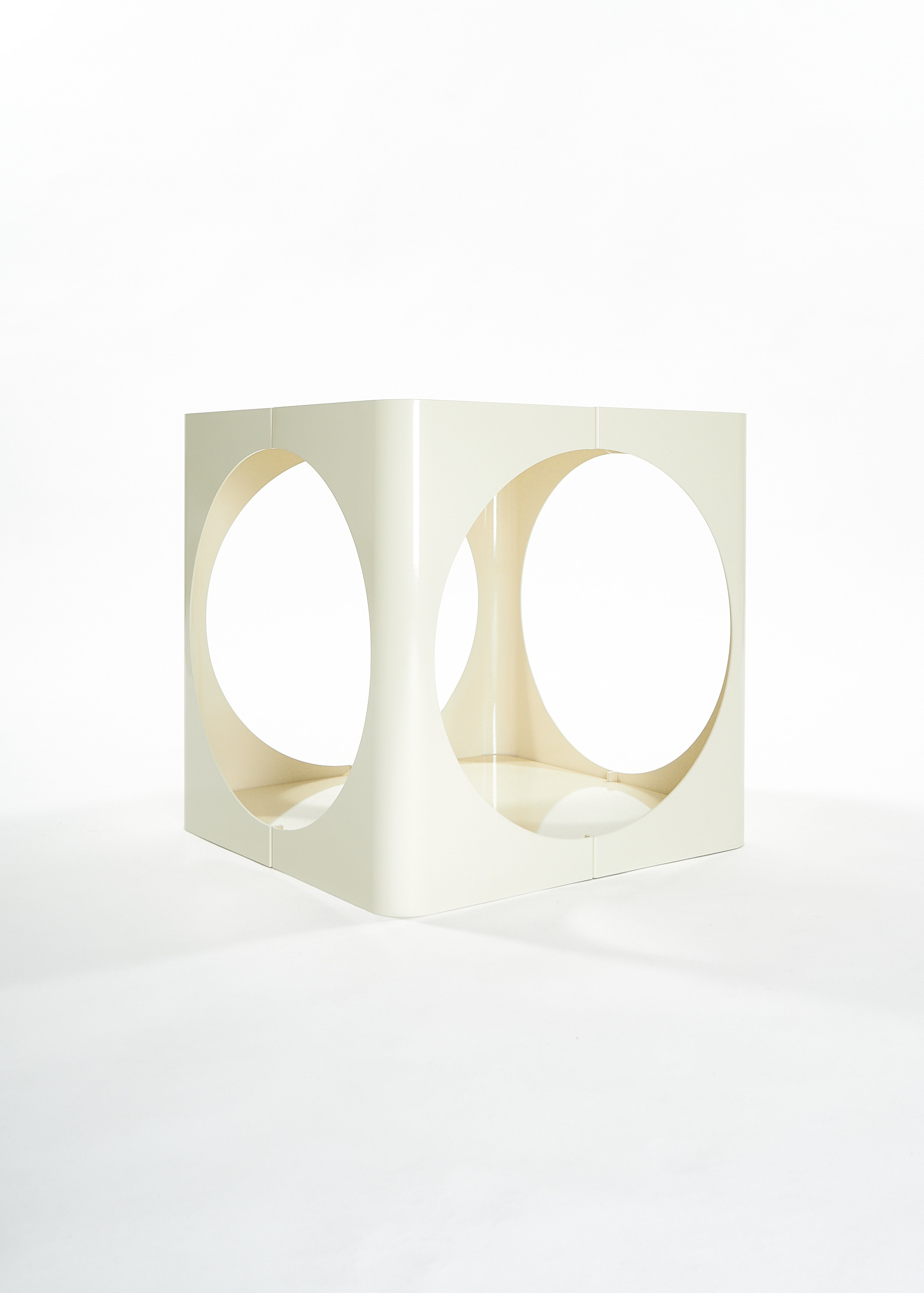 The RELAUNCH side table revisits a familiar modern design archetype: a cubic volume punctured by circular openings. While often associated with Joe Colombo, this form appeared in numerous variations throughout the late 1960s and 1970s, reproduced and reinterpreted so widely that its authorship gradually shifted from individual to collective.