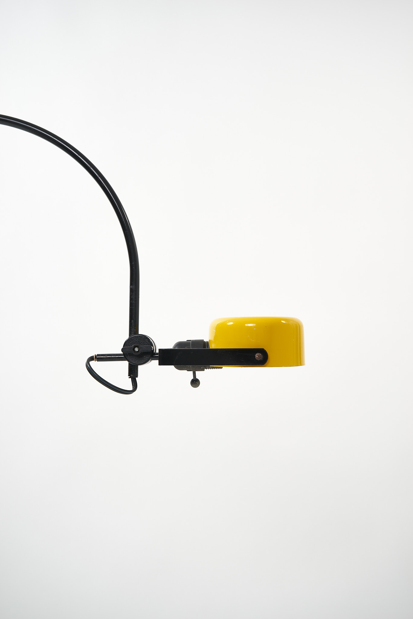 This clamp lamp is just one of many cool designs that were produced in the 1990s’ by the Montréal-based lighting manufacturer BAZZ. At the end of an arched mast sits a bright yellow diffuser which can be rotated on three axis in order to suit the lighting needs of the user. This stamped steel diffuser with slotted perforations is a distinct signature of the brand and was used in different collections over the years. The clamp mechanism at the base of the lamp can be attached to any flat surface with a maximum thickness of 2-1/2 inches.