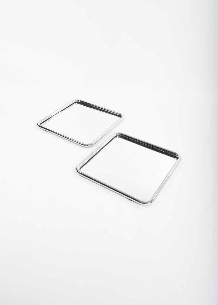 This silver mirror is framed by a square metal hoop made of chromed steel tubing. Although not much information can be found on this mirror, it is most likely from the 1970s’ and is reminiscent of the formal language of the Space Age design era.